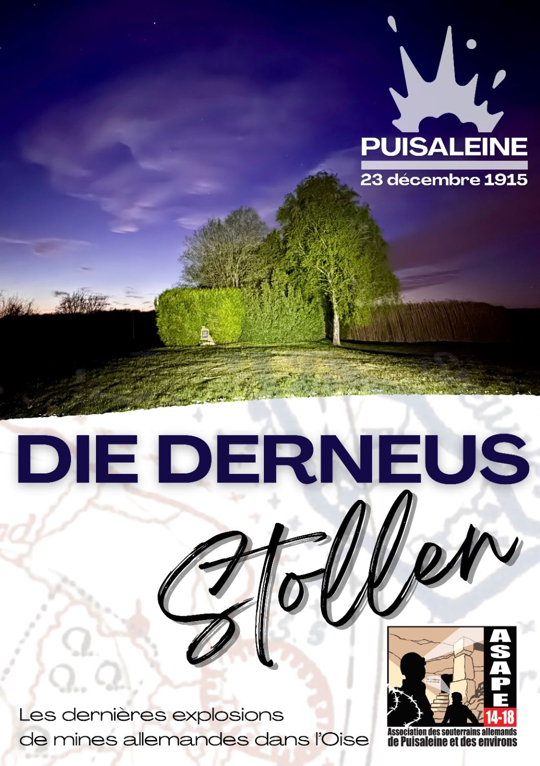 Le 23 décembre 1915 à 15h42, la plus importante des explosions de mines du secteur de l’Oise se faisait ressentir sur le secteur de Puisaleine. Le « DERNEUS Stollen», une galerie de mines allemande longue d’une cinquantaine de mètres va être surchargée avec presque 6 tonnes d’explosifs, placés à quelques mètres sous la première ligne française sur le site du « Champignon de Puisaleine ».